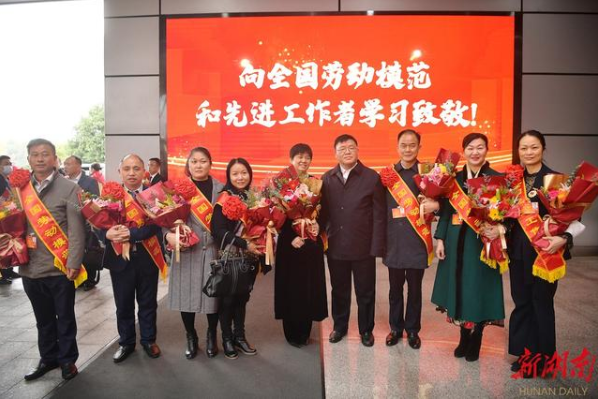 湖南日报·新湖南客户端11月25日讯(记者 郭芝桃 摄影记者 唐俊)今天中午,我省进京接受表彰的85名全国劳动模范和先进工作者载誉归来,省人大常委会副主任、省总工会主席周农带团返程。省总工会党组书记、副主席徐文龙和省总工会党组副书记、副主席王邵刚在长沙黄花机场迎接。
